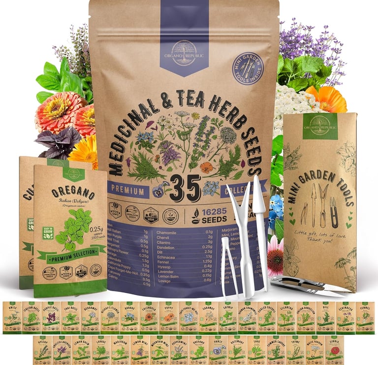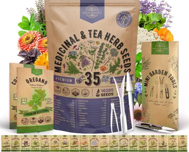 Huge Value - 35 Medicinal & Tea Herb Seeds for Planting Indoor & Outdoors. NON-GMO Heirloom Seeds for LESS THAN $1.10 PER SEEDS VARIETY - Over 16300 seeds: Anise, Italian, Thai&Purple Basil, Bergamot, Bishop's Flower, Borage, Calendula, Poppy, Cape Forget-Me-Not, Caraway, Catnip, Chamomile, Chervil, Cilantro, Dandelion, Dill, Echinacea, Fennel, Hyssop, Lavender, Lemon Balm, Lovage, Marjoram, Lemon&Mountain Mint, Peppermint, Oregano, Pansy, Rosemary, Sage, Summer Savory, Thyme, Yarrow, Zinnia